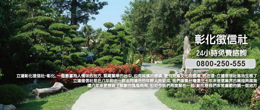 專業辦案透明價位 24時免費諮詢0800-250-555彰化徵信社服務包含離婚諮詢、行蹤調查、婚前徵信、尋人查址、工商徵信以及債務處理等服務,如有任何徵信相關問題皆可撥打24小時免費諮詢專線。