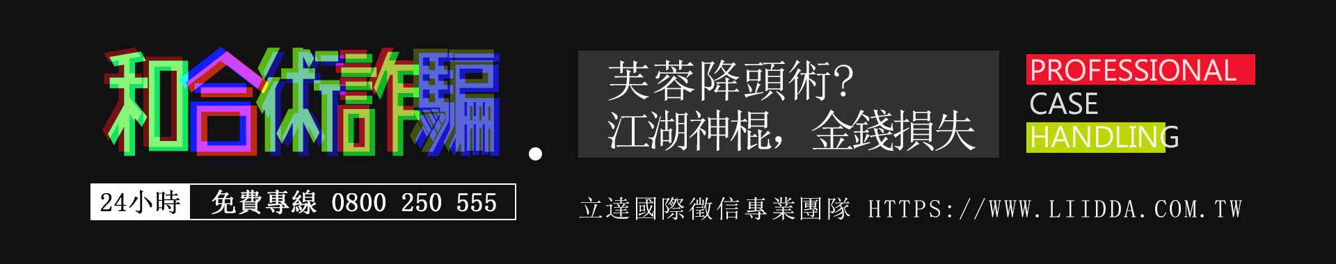 專業辦案透明價位 24時免費諮詢0800-250-555 和合來源之說,立達徵信社為您介紹條條大路或許通羅馬,但未必每條路都是康莊大道,賺錢餬口本身無可厚非,但沒有真才實學騙財騙色就令人不齒了。立達徵信社以下介紹和合術的詐騙例子,也提醒大家要小心這種江湖神棍,金錢損失事小、失節、受辱事大。立達徵信社提醒各位朋友,千萬不要讓這種和合術詐騙者得逞!!一對情侶蔡維哲、陳穎珊在網路上創立和合術網站,營造自己專業形象,並以「芙蓉堂降頭術」之名招搖撞騙,把上門求助的客戶唬得一愣一愣的,除了騙了客戶10幾萬,還要客戶拍裸照來安撫「天兵天將」。這樣的唬爛當然最後被揭穿,被台北地院依詐欺罪判刑。根據判決書指出,網站合夥人蔡男、許男、陳女三人分工合作,許男扮演施法的師傅-苗疆鐵軍師傅傳人,自稱懂得降頭、飛降等秘術。並特別強調自己是唯一傳人,法術淵源遠勝於市面上的茅山術。能夠處理別人沒辦法的問題…包含夫妻和合、男女感情紛爭、斬桃花、破煞,而且強調時效,當天就能見效。而蔡男則化名「盧師兄」、陳女化身為「芙蓉師姐」,你一句我一句把許男捧成無上天師,得到鐵軍師傅賞識,也成為唯一的宗師。一位邱姓人妻看了廣告上門,結果花了12萬也毫無成果,儘管每天燒符還是在付錢沒多久就收到離婚的訴訟狀,才讓她驚覺根本是鬧劇一場。另外一位陳小姐也是因為感情問題上門,男友最後決定跟別人結婚,讓她病急亂投醫,蔡男信誓旦旦表示,只要10萬元,就能以「和合術」幫助她挽回男人的心。陳女來來回回付了6萬多塊,甚至連裸照也傳給蔡男,終於心生警覺,男友不但絲毫沒有回頭的跡象,蔡男還一直要求匯錢。下定決心報警處理。一夥人上法庭,檢方要求許男當眾展現神力,以證實他確實是鐵軍傳人,但是許男說法反覆,一下說自己手沒力、一下以別的理由搪塞。也讓合議庭認定這男子根本就是神棍。利用別人感情脆弱時上下其手詐財,著實可惡。犯案的三人最後都被重判,甚麼包復合的和合術、神通力,最後證明都是漫天大謊,子虛烏有呢。
