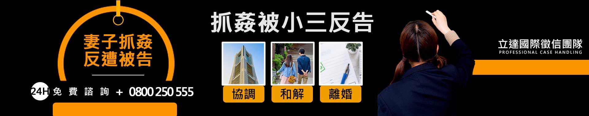 專業辦案透明價位 24時免費諮詢0800-250-555 帶給客戶安心、解決問題的徵信社。半年前高雄一名林姓女子因為跟丈夫長期爭吵,丈夫到外面外尋溫暖,林姓女子知道自己的丈夫疑似有外遇,氣的找上徵信社幫忙,前前後後林姓女子總共花了新台幣150萬元,林小姐請了高雄某家知名徵信社來幫忙蒐證跟抓姦,在一個月前丈夫又告知林姓女子要出去找朋友,林姓女子半夜與徵信人員會合感到小三住屋處準備抓姦,林姓女子和徵信人員在外面等到了時間差不多,一群人立刻偷偷的翻牆衝入小三家中,一群人小心翼翼地走到主臥房,當時一闖進去就抓姦在床,妻子也氣的怒告兩人通姦,丈夫與小三兩人遭依通姦罪起訴,不料丈夫與小三兩人心有不甘反控林姓女子侵入住宅,為了避免吃上官司林姓女子最後妥協,雙方協調和解,不過林姓女子也跟丈夫提出離婚。