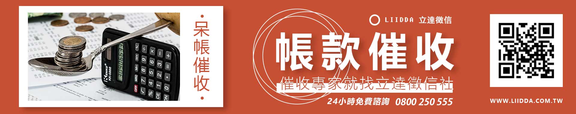 專業辦案透明價位 24時免費諮詢0800-250-555 催收專家立達徵信社望著收不回來的呆帳,心在淌血嗎?覺得自己落入血本無歸的的地獄?立達徵信在帳款催收擁有豐富的經驗,我們有標準的作業流程、受過訓練的專業催收人員,合法的協商方式,助您解決呆帳的問題。立達徵信社催收帳款流程:• 審慎評估債務人的還款能力,訂定合理的還款催收計畫。• 對債務人進行詳細的身家背景調查。• 將迅速提供初步評估報告給委託人。• 拜訪債務人,了解實際狀況,以利徵信社帳款催收。• 合法磋商,按月進行收款,並定時向委託人報告。立達徵信社是合法立案之公司,在帳款催收方面,絕不使用暴力手段,一切合法進行,在徵信結案後,我們將會銷毀所有有關資訊,並與您毫無瓜葛。徵信調查、催收行為所涉及的法律責任皆由我方自行負擔,帳款合法催收,就找轉業、誠信、合法的立達徵信社。