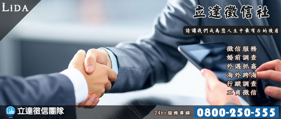 專業辦案透明價位 24時免費諮詢0800-250-555 外遇蒐證專家-立達徵信社現代社會,男女性觀念開放,職場壓力、夫妻感情不睦、子女教育觀念不同等,都可能造成外遇出軌的原因。婚姻出軌不再是男人的專利,妻子外遇小王在近來的社會風氣下也越來越常見。立達徵信社建議您,若您發現另一半出軌時,不要急著生氣、怨天尤人,委託立達徵信社,我們將派遣最專業的調查員,將丈夫的外遇行為蒐證完成,抓姦在床,讓姦夫淫婦難逃法網。立達徵信社以下將對常見的問題予以解答。