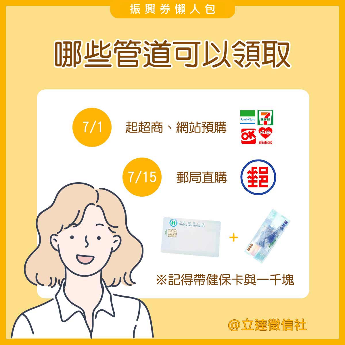 (B)郵局:7/15起帶著健保卡及1000塊換取振興券