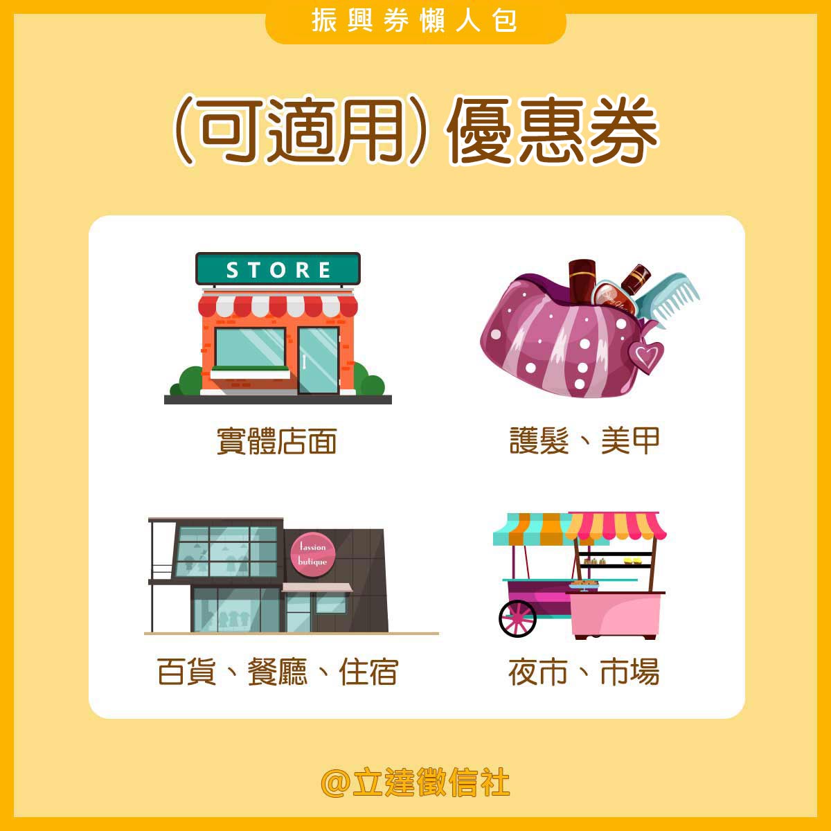 可以使用:實體店面、護髮、美甲、餐廳、百貨、夜市、住宿、市場…