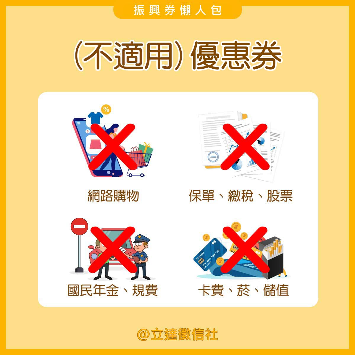 不可以使用:網購、繳稅、規費、菸、保單、股票、國民年金、卡費、儲值、禮券…
