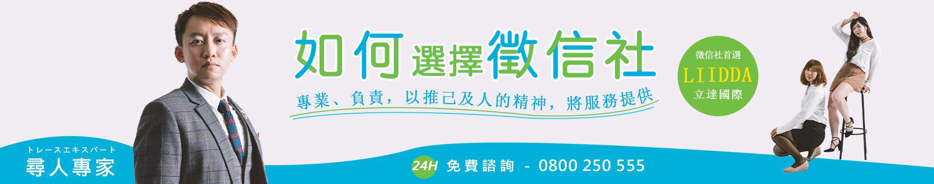 專業辦案透明價位 24時免費諮詢0800-250-555 尋人專家立達徵信社徵信社公會所刊登之公司不一定都是有政府立案的公司,常常會有一牌多用的情形,只有一張執照卻架設眾多的網站、創設繁多的徵信社名稱,讓消費者誤以為能夠貨比三家,選擇最好的,殊不知被蒙在鼓裡。因此在選擇徵信社時,切勿急病亂投醫,應該先於新聞上查詢有無涉及暴力討債、違法經營等,也可委託徵信社調查,因為同業間的了解一定會必外界多。另外,可從該徵信社線前曾經承辦中的案件,看出該徵信社的能力與辦案方式,而非一味選擇廣告最大、女人為主、退役軍警所創設的徵信社,應多方參考。徵信社公會,可提供您選擇徵信社的一個管道,但內容該相信與否,就要靠您自己的過人智慧了,因為公會往往是球員兼裁判,如同頂新魏家所職掌的GMP認證標章相同。立達雖然是間小公司,但我們秉持專業、負責,以推己及人的精神,將服務提供給有需求的民眾,若您遭遇困難,請給立達徵信一個機會,陪您一起度過難關。