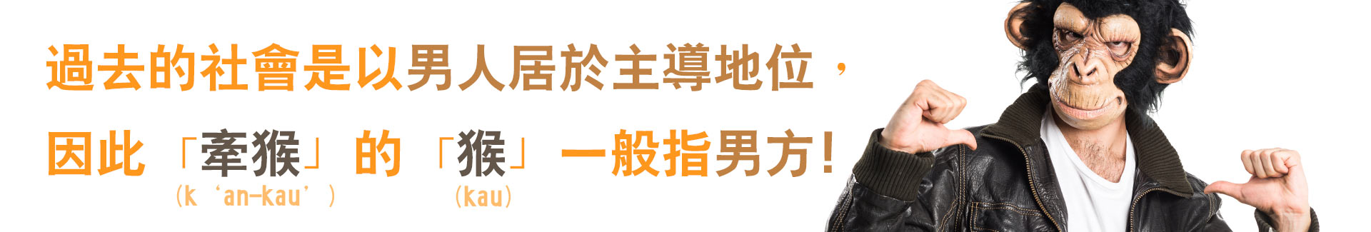 台語「牽猴」本來指牽引猴子。耍猴戲的人總是把繩子的一端套在猴子的脖子上,一端抓在手上,牽著猴子走。很可能從牽引猴子比喻引伸而產生牽線、仲介、媒介等意義,於是居中牽引男女雙方發生不正常的性關係就叫做「牽猴(k‘an-kau’)」了。