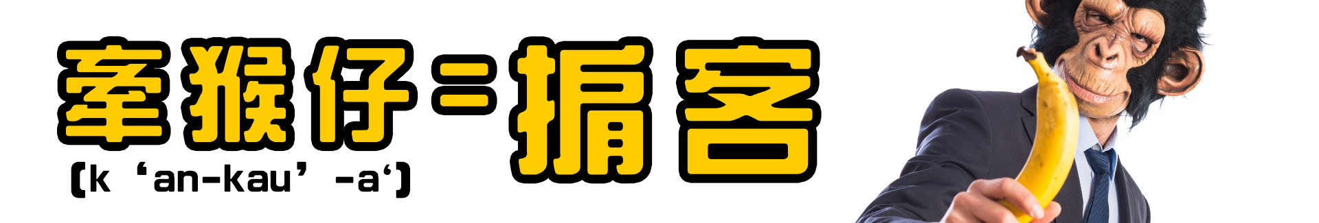 也指介紹買賣等並從中得利的行為(即中介、居中牽線),從事這種行為的人叫做「牽猴仔(k‘an-kau’-a`)」,即掮客。