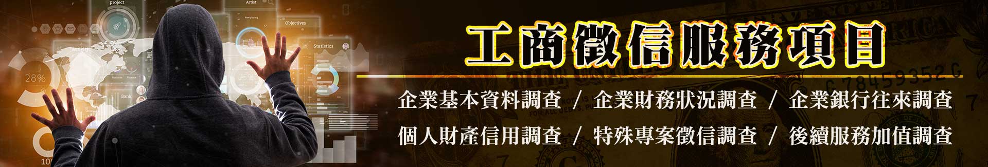 ■ 企業基本資料調查 ■ 企業財務狀況調查 ■ 企業銀行往來調查 ■ 個人財產信用調查 ■ 特殊專案徵信調查 ■ 後續服務加值調查