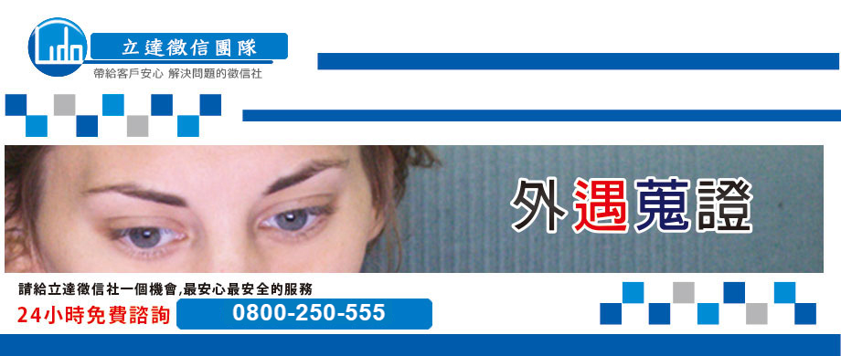 專業辦案透明價位 24時免費諮詢0800-250-555 證據調查專家立達徵信社婚外情,其實不足為懼,怕的是,您沒有勇氣誠實面對困難!!立達徵信社會根據不同的委託人情況,訂定合適的解決之道,另一半出軌了,若您對他依舊珍惜,我們能夠提供您感情挽回的服務;若您已覺得婚姻真的無法繼續下去了,那麼,抓姦在床,將會是您的應對首選。保存婚姻、終結壞婚姻您的一念之間,立達徵信社提供業界最貼心的服務,凡事以客為尊,若您有外遇正、抓姦等相關需求,歡迎來電洽詢。