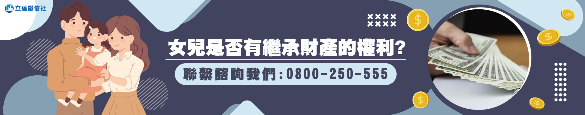 今日女兒無論結婚與否,依法皆有繼承權,且其權利與男性相同。 民法 第 1138 條 (法定繼承人及其順序) 遺產繼承人,除配偶外,依下列順序定之: 一、直系血親卑親屬。(子、女) 二、父母。 三、兄弟姊妹。 四、祖父母。 立達徵信社竭誠歡迎您 讓我們幫助您解決問題