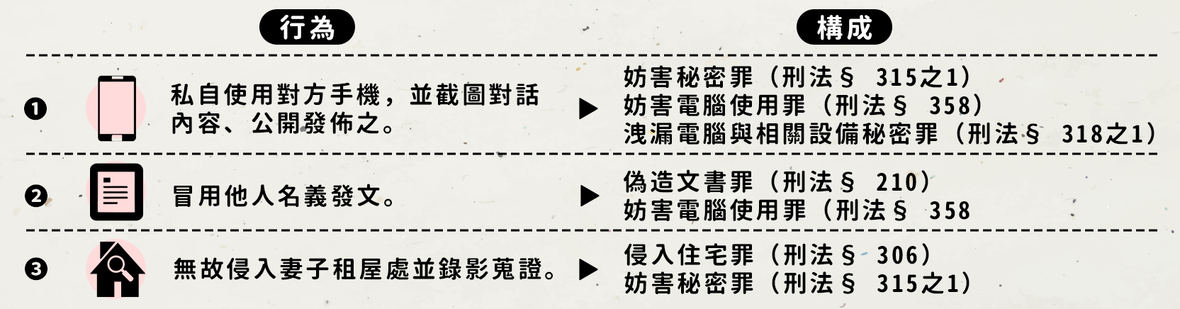 | 翻拍伴侶手機的對話訊息 | 由於許多伴侶會互相察看手機,此行為雖未經同意,但經權衡下可作為裁判依據。 | ○ |
