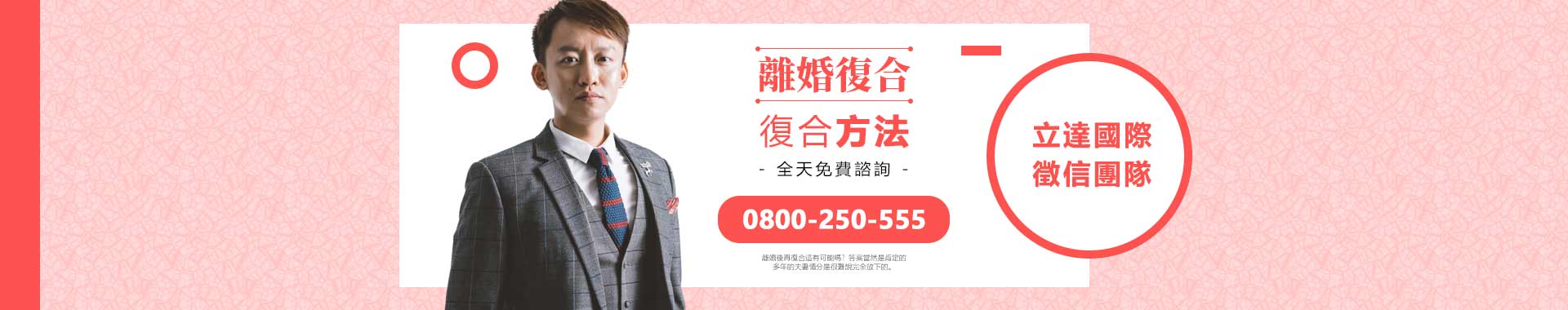 專業辦案透明價位 24時免費諮詢0800-250-555 離婚復合的方法離婚後再復合這有可能嗎?答案當然是肯定的,多年的夫妻情分是很難說完全放下的。所謂,百年修得同船渡,千年修得共枕眠。若按照這樣的說法,這夫妻間的緣分是千年所修來,又怎麼可能會輕易的斬斷呢?離婚復合本來就不是不可能,其原因有很多,除了深厚的感情基礎以外,最重要的還有孩子的存在,孩子是兩個人在一起愛的結晶,也是兩個人一輩子的心頭肉,為了孩子其實有很多夫妻還是願意選擇再給對方一個機會的,而沒有孩子的婚姻,雖然少了這一項羈絆,但也不至於不可能離婚復合,只要有心加上用對方法,離婚復合絕對是有可能的事情。立達徵信社對於離婚復合的服務已經有多年業績,對於離婚復合的經驗非常豐富,我們相信婚姻的美好,也相信愛的力量,所以即使是赴湯蹈火也在所不惜,只要委託人的心意堅決,我們評估挽回的可能性後,將會採取相對應的手段來替委託人完成託付,所以如果您有離婚復合的服務需求,請不要猶豫立即與我們聯絡,請讓我們一起陪您渡過婚姻的瓶頸,找回婚姻中失去的美好。