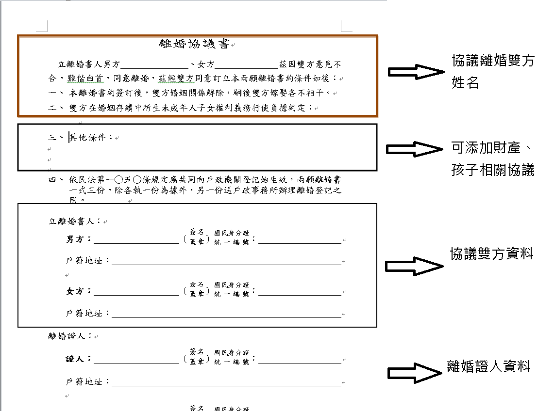 (2) 離婚證人,確實知曉夫妻雙方離婚意願的「二位成年證人」(親朋好友亦可當證人),在合法的程序中,證人需親自在離婚協議書上簽名蓋章,最保障的做好是四人面對面一起簽名蓋章。