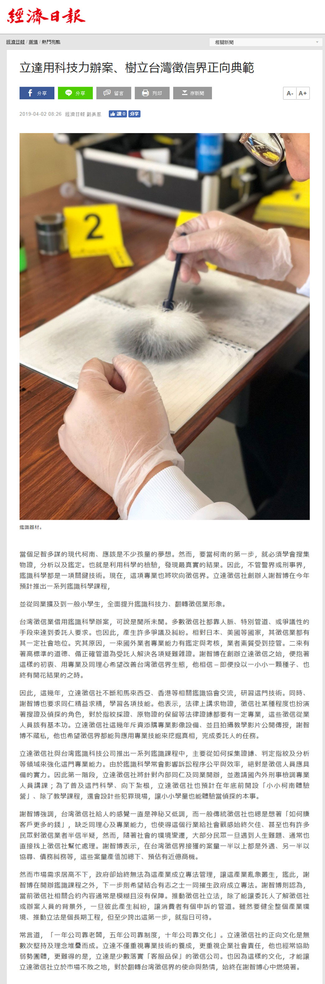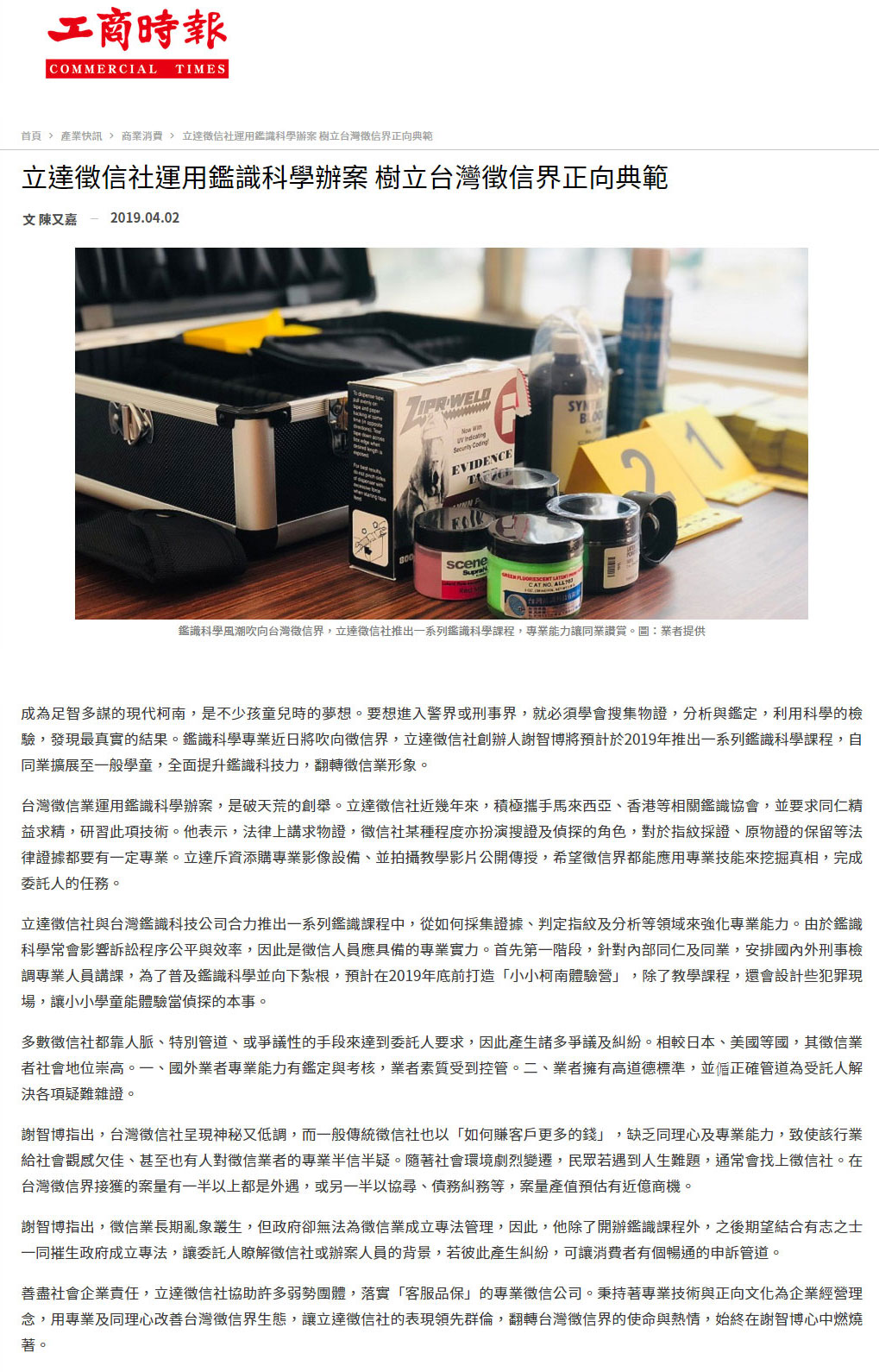 報導來源: 工商時報-立達徵信社運用鑑識科學辦案 樹立台灣徵信界正向典範