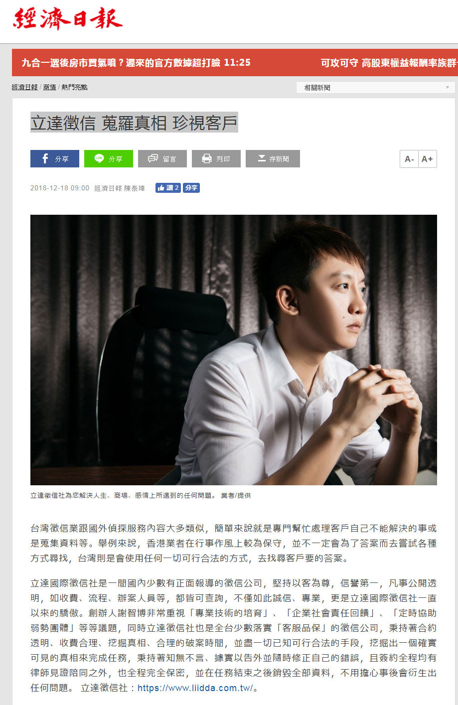 報導來源:經濟日報-立達徵信 蒐羅真相 珍視客戶