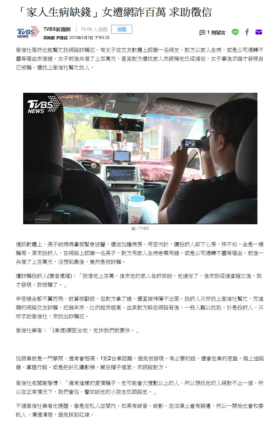 報導來源:TVBS-家人生病缺錢」女遭網詐百萬 求助徵信