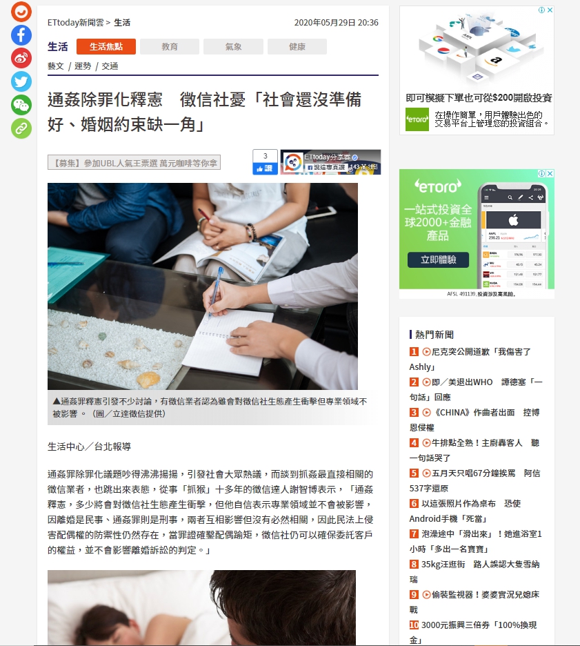 通姦罪除罪化議題吵得沸沸揚揚,引發社會大眾熱議,而談到抓姦最直接相關的徵信業者,也跳出來表態,從事「抓猴」十多年的徵信達人謝智博表示,「通姦釋憲,多少將會對徵信社生態產生衝擊,但他自信表示專業領域並不會被影響,因離婚是民事、通姦罪則是刑事,兩者互相影響但沒有必然相關,因此民法上侵害配偶權的防禦性仍然存在,當罪證確鑿配偶踰矩,徵信社仍可以確保委託客戶的權益,並不會影響離婚訴訟的判定。」