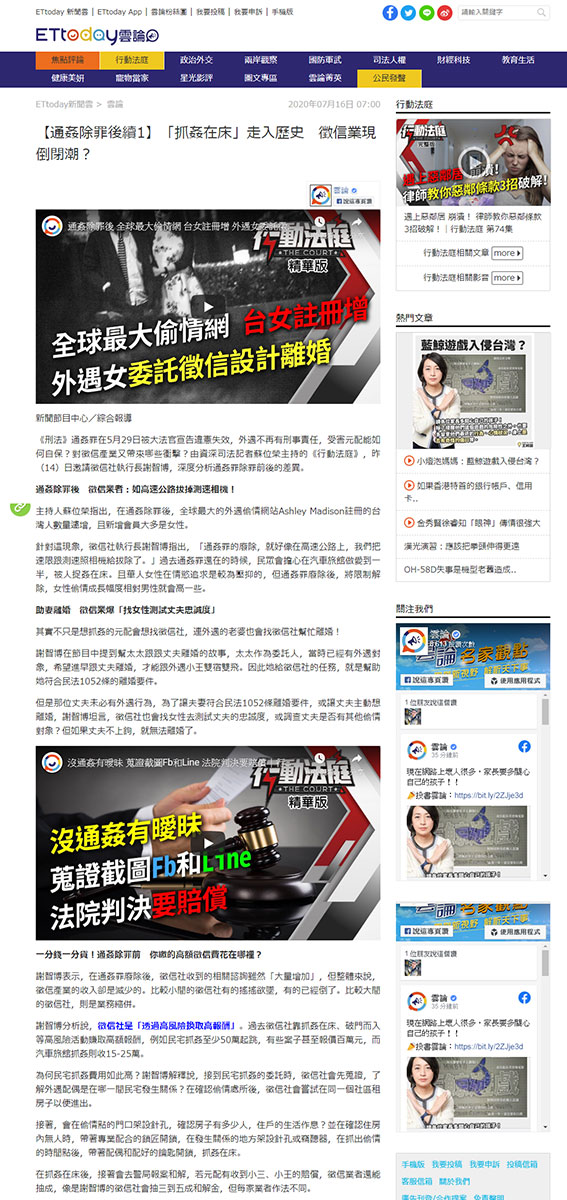 《刑法》通姦罪在5月29日被大法官宣告違憲失效,外遇不再有刑事責任,受害元配能如何自保?對徵信產業又帶來哪些衝擊?由資深司法記者蘇位榮主持的《行動法庭》,昨(14)日邀請徵信社執行長謝智博,深度分析通姦罪除罪前後的差異。