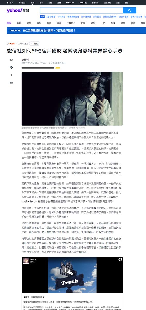 然而所有誆騙的手法之中,有個常用在老徵信(用來稱呼從1980-1990年代就從事這個行業的人、或是用類似手法進行營生的人)的core ability---也就是心理學家提到的「虛幻真相效應」(illusory truth effect)---藉由給予目標持續且重複的某個概念或消息,令目標相信其為正確的。