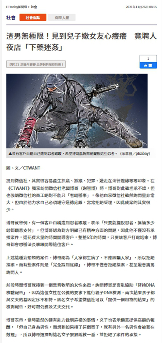 提到徵信社,其實很容易產生抓姦、抓猴、犯罪、遊走在法律邊緣等等印象。在《CTWANT》獨家訪問徵信社老闆博哥(謝智博)時,博哥對此雖坦承不諱,但也強調徵信社的員工絕對不能只「看錢辦事」,像他自家徵信社雖然詢問量非常大,但由於他力求自己必須謹守道德底線,常常拒絕受理,因此成案的其實很少。