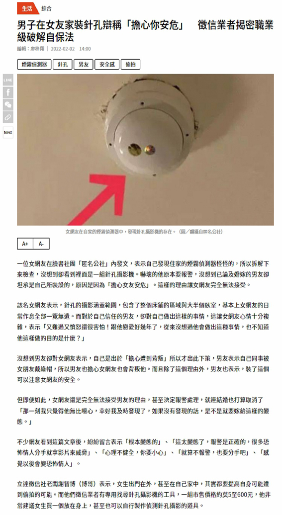 一位女網友在臉書社團「匿名公社」內發文,表示自己發現住家的煙霧偵測器怪怪的,所以拆解下來檢查,沒想到卻看到裡面是一組針孔攝影機。嚇壞的他原本要報警,沒想到已論及婚嫁的男友卻坦承是自己所裝設的,原因是因為「擔心女友安危」。這樣的理由讓女網友完全無法接受。