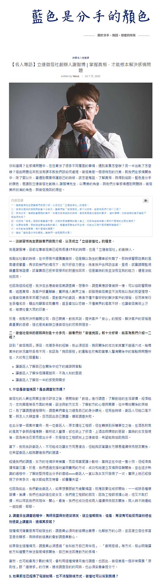 其實,目前立達徵信社不論是接案量,或者是行銷策略的發展,在業界都稱得上是數一數二,得到消費者的信賴。