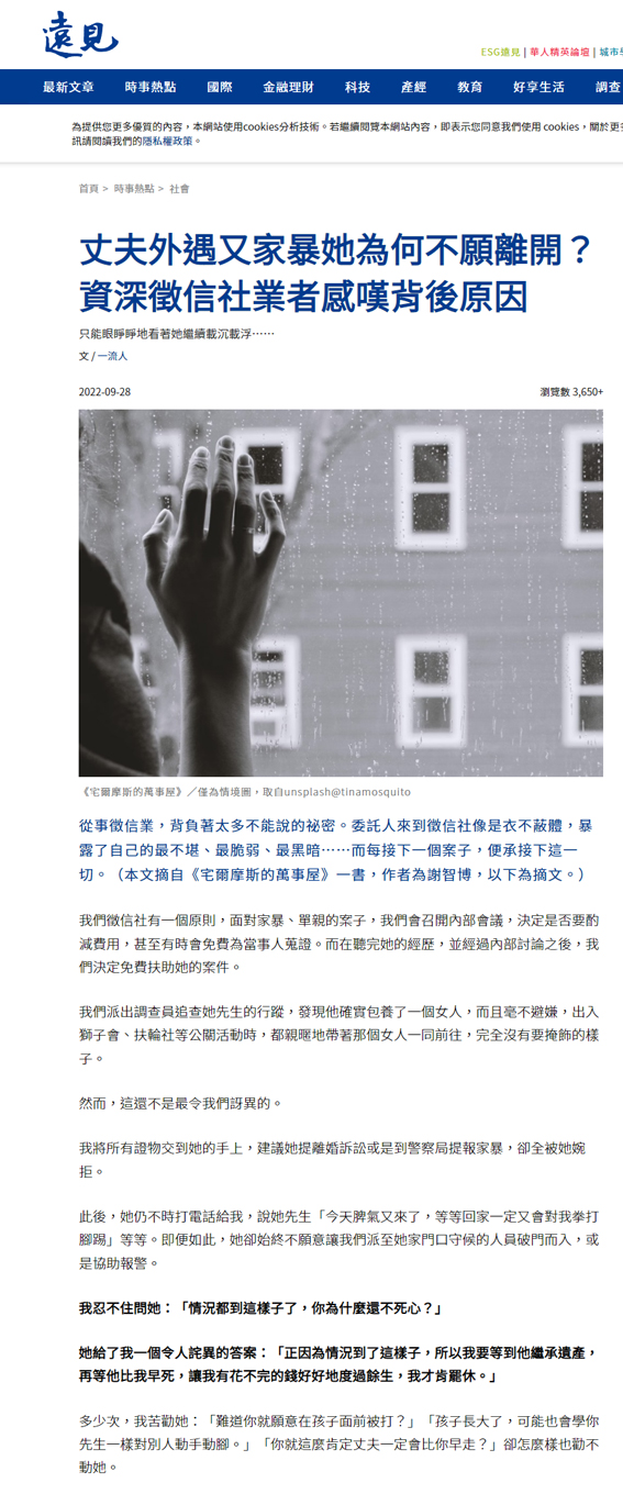 我隱約猜到,可能是她已經習慣了這樣的生活,不相信自己還有能力出去工作,不相信自己還有能力覓得其他良人。她寧願每個月領著先生施捨的8千元餬口,也不願意離開眼前這段早已爛透的關係。