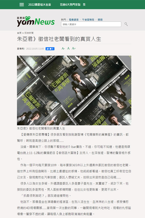 【愛傳媒朱亞君專欄】很多朋友看到我貼謝智博《宅爾摩斯的萬事屋》的書訊,都驚呼:啊就是高速公路上的那個……
