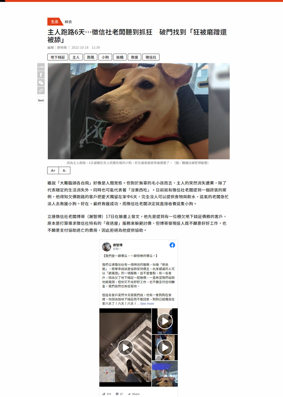博哥文末表示「看到狗狗活著,比甚麼都開心。我們是一群傻瓜,但是是一群快樂的傻瓜。我相信其他徵信業者不可能花錢花心力,去做這件沒有任何利益的事情,但我們會,而且做得很爽。」