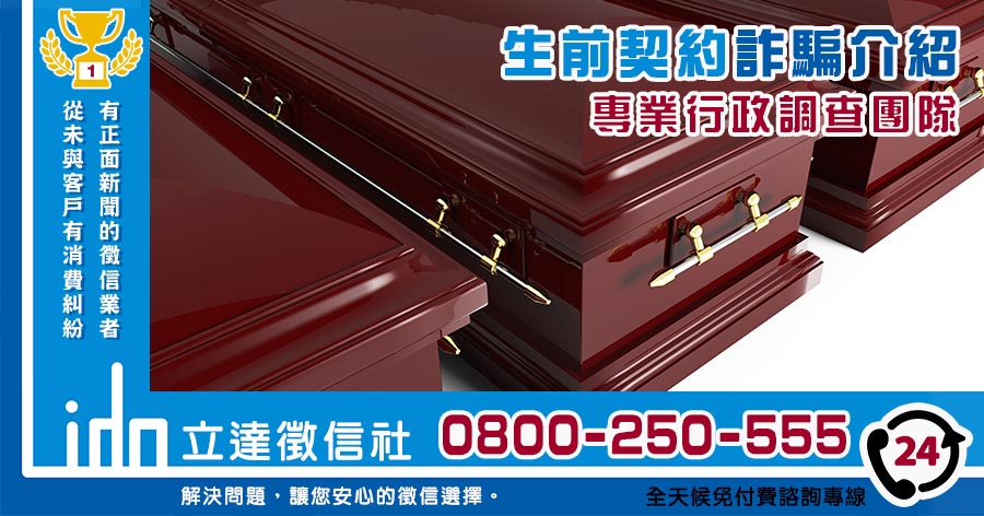 您有聽過生前契約嗎?這是生前契約業務員開口攀談的第一句話,大家最近應該都有聽過生前契約的名稱吧!為了避免大家看到現在依舊是對於「生前契約」一頭霧水,就讓徵信社小妹替您提供淺顯易懂的生前契約介紹吧! 立達徵信社處理生前契約詐騙案生前契約的詐騙,通常是利用生前契約未來前瞻性,生前契約未來增值性,做為吸引他人購買生前契約的噱頭,因為生前契約的價錢不便宜,所以吸金的效果非常強,若是對方收了錢,卻不辦事,坑騙所有的投資人,投資人若是投資時,並沒有看清楚生前契約公司有沒有信託,當公司總裁,捲款潛逃後,那麼廣大的買家,很可能就會面臨求助無門的情況,所以,若是您現在沒有需要買生前契約,而對方卻是拼命地鼓吹買生前契約的有利性,您可能就需要多加注意了。如果您在簽訂生前契約後,發現有異,想要退掉,對方卻不同意時,您可以委託生前契約詐騙案處理專家,立達徵信設專業行政調查團隊,替您進行解決,我們有豐富的經驗,可以替您與老奸巨猾的對方,爭取到合理解決方案,請打0800-250-555。 |