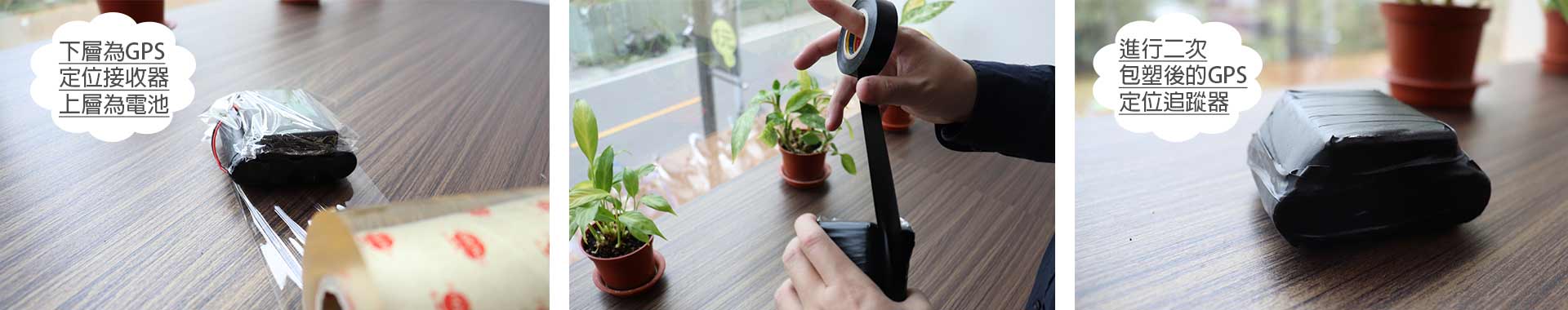 GPS定位追蹤器又分成電池與定位接收器兩個,安裝之前必須將兩者使用熱封膜包覆進行第一層的塑形,有些人會問為什麼要塑形?