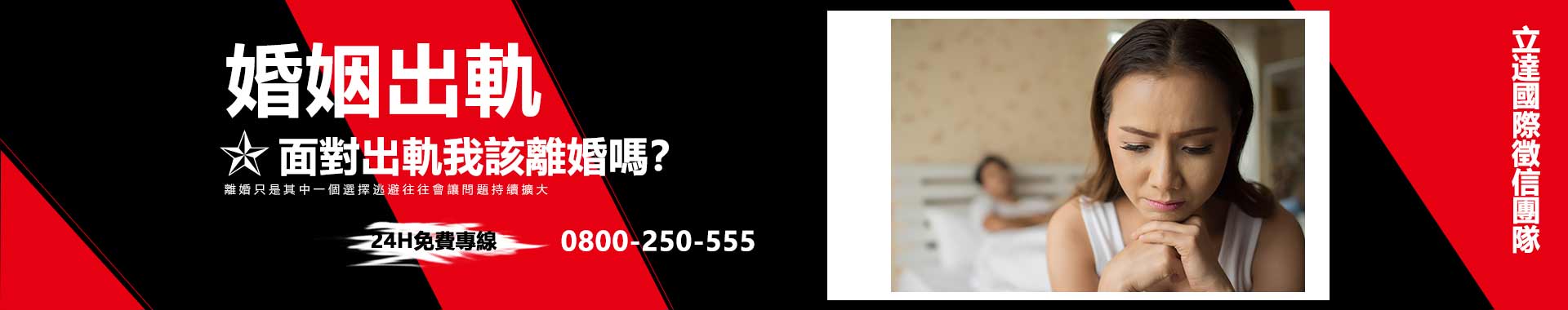 專業辦案透明價位 24時免費諮詢0800-250-555 逃避往往會讓問題持續擴大婚姻出軌的情況被揭穿後,雙方一定要離婚嗎?其實您不一定要選擇離婚,相反的,選擇堅守婚姻也會是一項好的選擇。根據調查,婚姻出軌問題發生之後,繼續維持婚姻的配偶其實有很大的可能會擁有新的開始,有一個更健康的婚姻生活。通常檢討婚姻中發生外遇的一方,其實大部分都不是故意要發生外遇的,有的是因為工作壓力而與同事發生不倫,有的則是覺得在家得不到配偶的尊重和關愛,以至於心裡空虛才禁不住外界的誘惑而發生外遇,像這樣的情況,對很多家庭來說都是普遍存在的問題,所以面對婚姻出軌,絕對不可以姑息養奸,最好的方法就是盡早處理,以免留存禍根,試想,若是婚姻出軌問題演變成為外遇生子問題,那麼只會讓傷害更加擴大。面對婚姻出軌問題,我們不該選擇逃避,逃避現實往往只會讓問題持續擴大,到最後更有可能發展到一發不可收拾的地步,正確的態度應該是積極的去面對它,並且解決它。沒有人會在人生中都是一帆風順的,即使是感情再好的夫妻,只要讓第三者有了可以趁虛而入的空隙,還是有可能發生婚姻出軌的問題,立達徵信社在婚姻出軌問題擁有豐富的經驗,絕對是您可以放心、安心委託的徵信夥伴,若是您有任何關於婚姻出軌的疑義,也非常歡迎您來電連絡我們與我們洽談諮詢,我們24小時全天候服務,請讓我們陪您一起走過婚姻的瓶頸,痛擊外遇問題,迎向美好未來!
