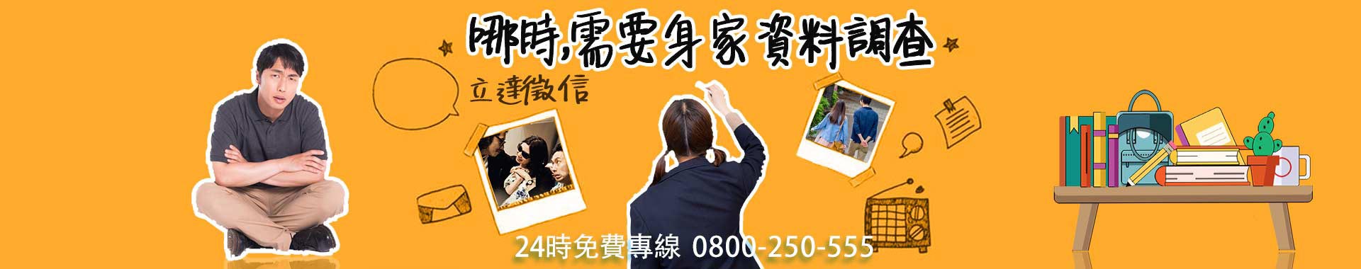 專業辦案透明價位 24時免費諮詢0800-250-555 婚姻不是豪賭,了解才是關鍵立達徵信社提醒您,沒有一個人可以完全的了解對方,只有各種角度的審視才能對一個人了解透徹,可是一個人就只能看到一個角度,所以徵信社才有了個身家調查的服務業務,就是希望幫助委託人從各個不同的面向去了解一個人,讓您可以分辨好壞、看清善惡。立達徵信社開業八年多來,在業界是唯一擁有正面新聞的徵信社,收費價格也是一律採取公開與透明化的作業標準,絕對是一家能讓您安心、放心前來委託問題的優質徵信社若您有任何關於身家背景調查的疑問,都歡迎您來電洽詢,讓我們竭誠為您服務!