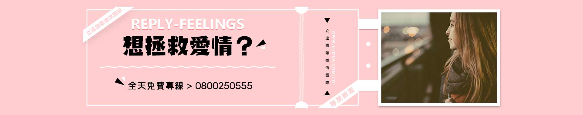 專業辦案透明價位 24時免費諮詢0800-250-555 感情拯救-立達徵信對於分手結果感到懊悔和痛苦的人,最希望的也許就是時光能再倒流,回到爭吵和誤會發生之前的那一刻,那麼也許現在的一切都將有所不同,但是時光倒流是不可能的,只有靠自己的力量挽回感情才是最真實的。感情回復最著要的地方就是要能做到傷痕治癒,分手必有原因,而一次的爭吵只是一次點燃導火線,累積爆發的卻是長期沒有得到治癒的心。日常生活中一點一滴的誤會和爭執,都是傷口形成的來源,也許微不足道,可是長期累積下來也是會讓人無法繼續承受的,所以希望感情回復能順利的你,最好要能有好的方法來幫助彼此痊癒心傷,否則就算一時感情回復成功,只要問題沒有根絕,也很難穩定長久。立達徵信社相信,沒有一段感情是下定決心也挽回不了的,只要有心,再加上可靠的幫助,感情回復是有很大成功機率的,大多數的感情都會有所謂的慣性存在,例如戀人們習慣了晚上有對方道晚安,或是天起冷的時候有個人在旁叨擾關心著要添加衣物,只要這些習慣的感覺還沒有消失,我們就很有機會可以為您找回遺失的美好!有任何感情回復的需要嗎?交給立達吧!我們24小時全天候服務,等您來電!
