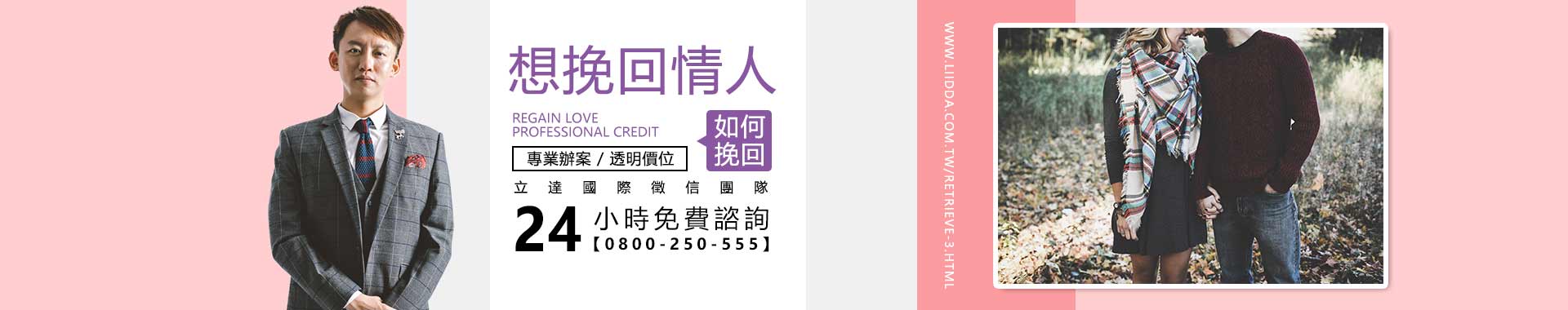 專業辦案透明價位 24時免費諮詢0800-250-555 想要挽回情人?挽回情人確實不是一件容易的事情,再大的徵信社也沒辦法跟任何尋求感情挽回的委託人保證一定挽回成功,這是因為人的心會隨著時間而淡忘許多事情,包含昔日的感情,所以挽回的決定一定不可以拖,只要一拖超過一定的時間,挽回成功的機率也會慢慢的下降,為了有效的挽回情人,委託人也必須要下一定的決心,這樣才能讓徵信社幫助委託人傳達最真切的情感來感動委託人的另一半。立達徵信社開業八年多來,在業界是唯一擁有正面新聞的徵信社,收費價格也是一律採取公開與透明化的作業標準,絕對是一家能讓您安心、放心前來委託問題的優質徵信社,若您對於挽回情人有任何疑義,都歡迎您致電前來諮詢,我們24小時全天候為您服務!